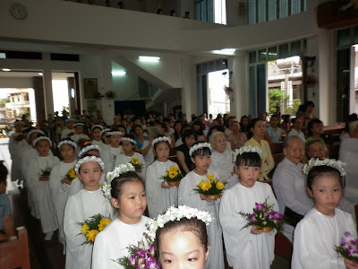 Sau khi cha phụ tá kết thúc cuộc cung nghinh qua việc xông hương tôn vinh thánh tượng, buổi dâng hoa được bắt đầu do đoàn thiếu nhi Thánh Thể phụ trách. Các con hoa đã dâng lên Đức Mẹ những đóa hoa lòng thay cho cả cộng đoàn và dường như với lòng yêu mến, tôn sùng Đức Mẹ của cộng đoàn phần nào đã xua tan đi cái nắng chói chang, oi bức của những ngày cuối tháng Tư tại Saigon.